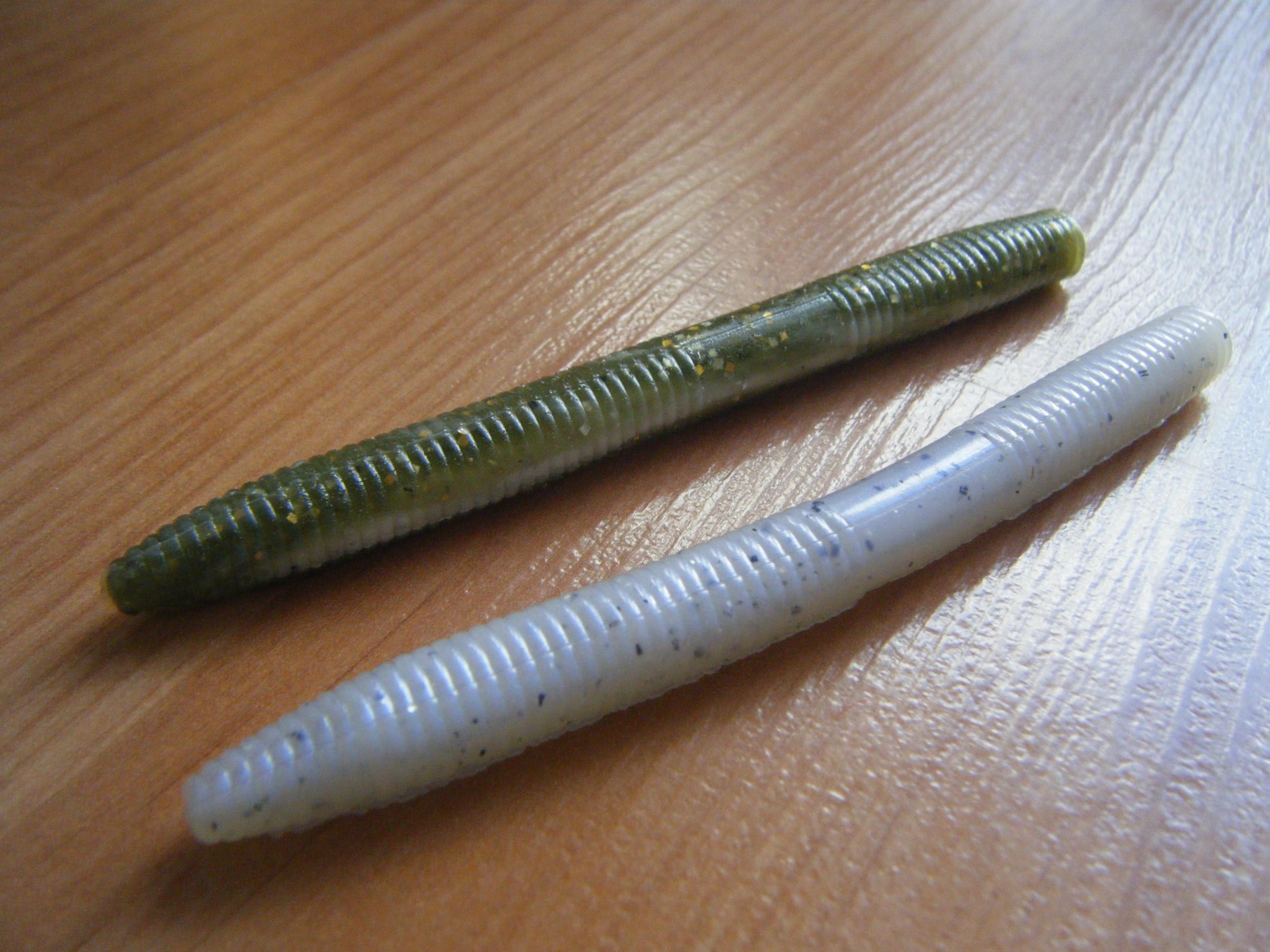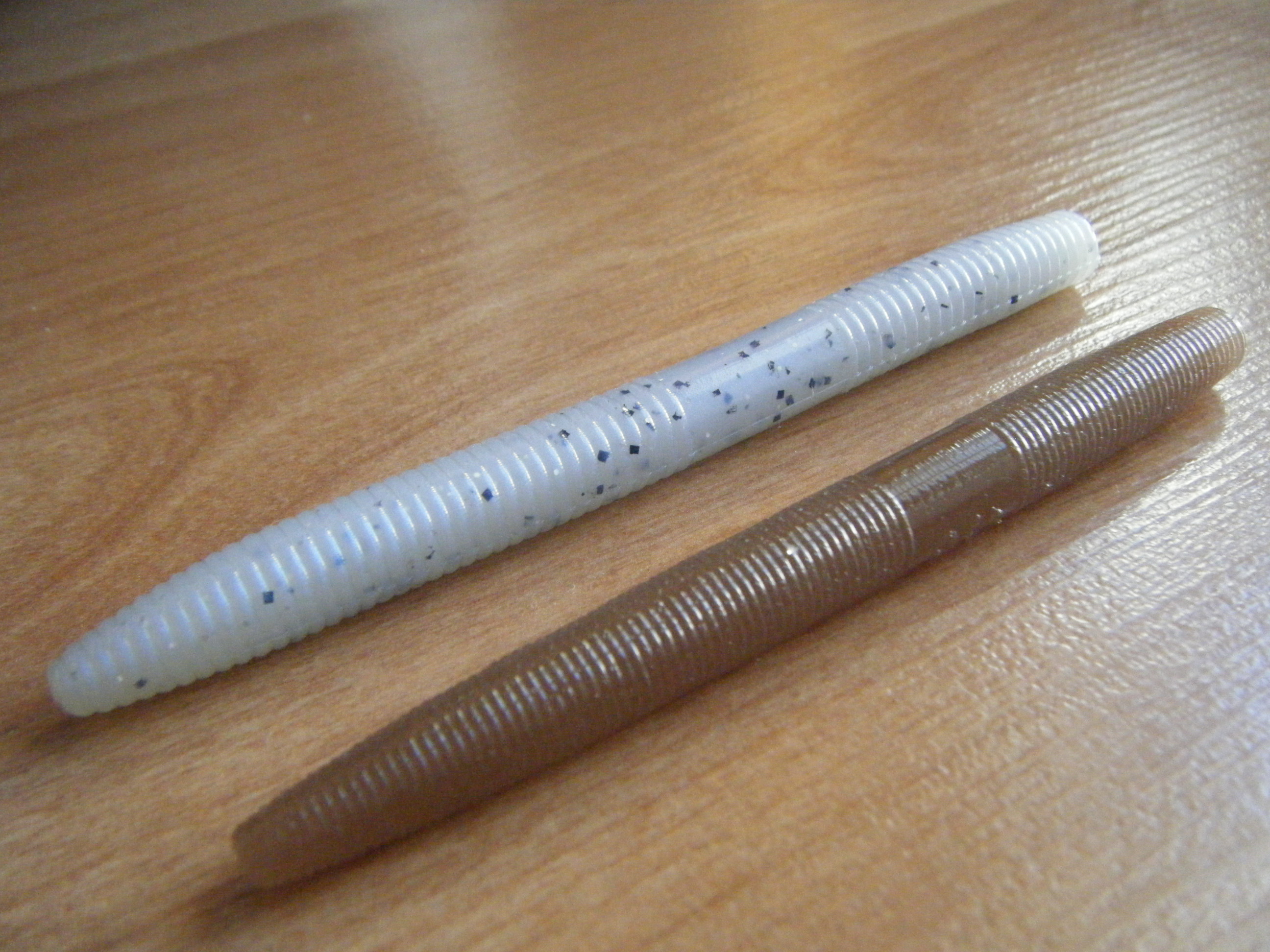 Comparación del liqvidd stikk en color blue pearl y un senko en cinnamon brown.
