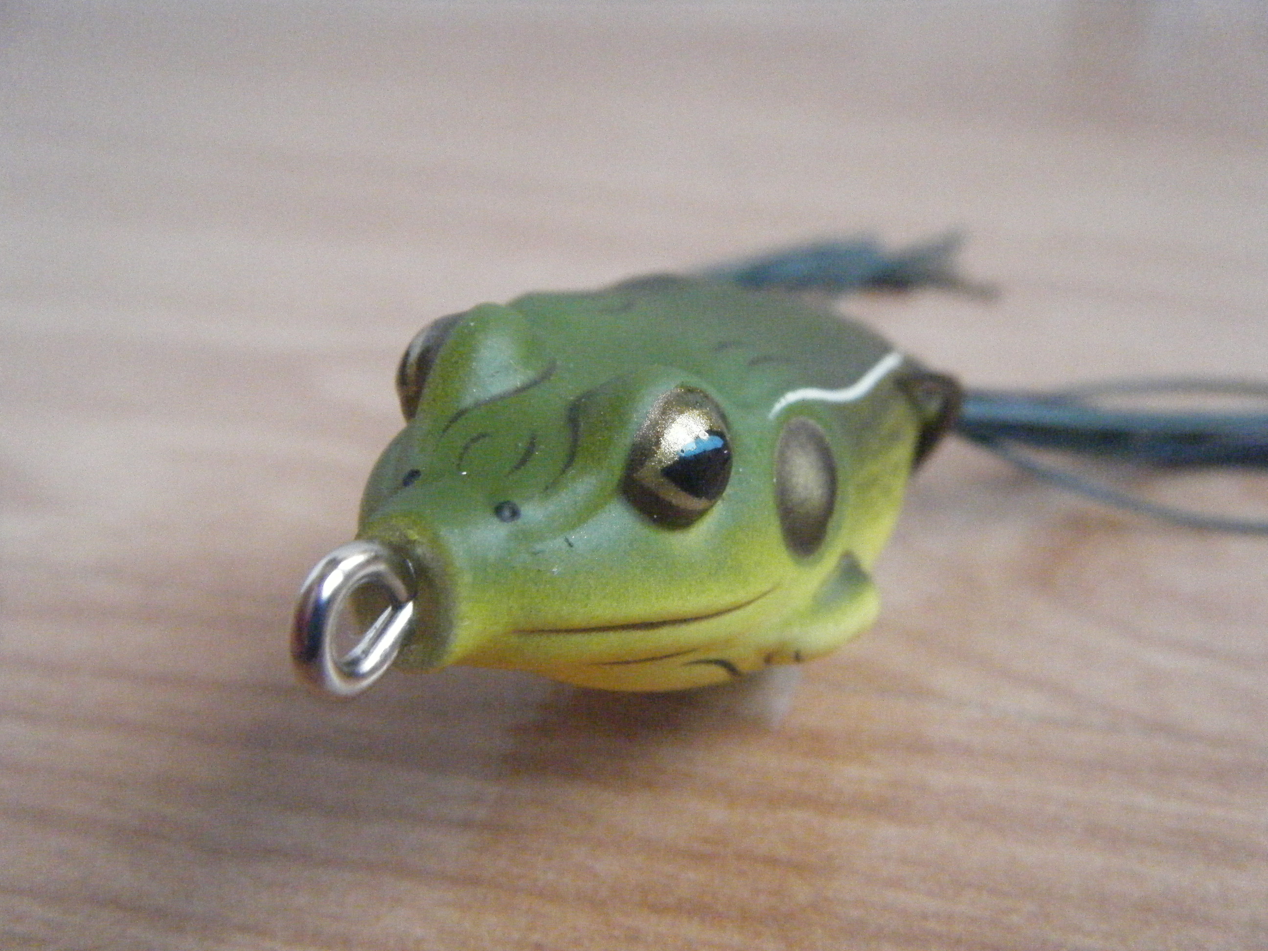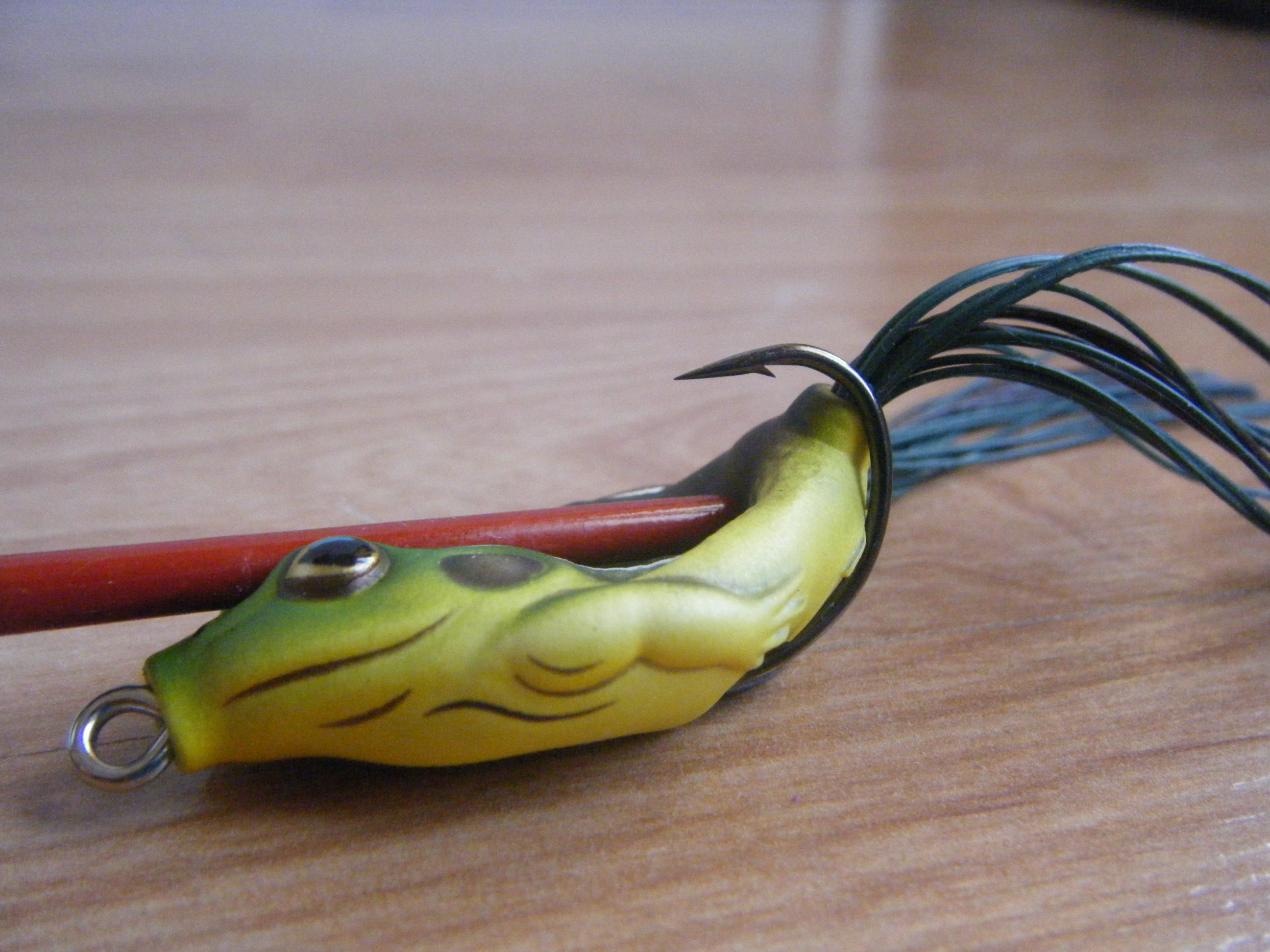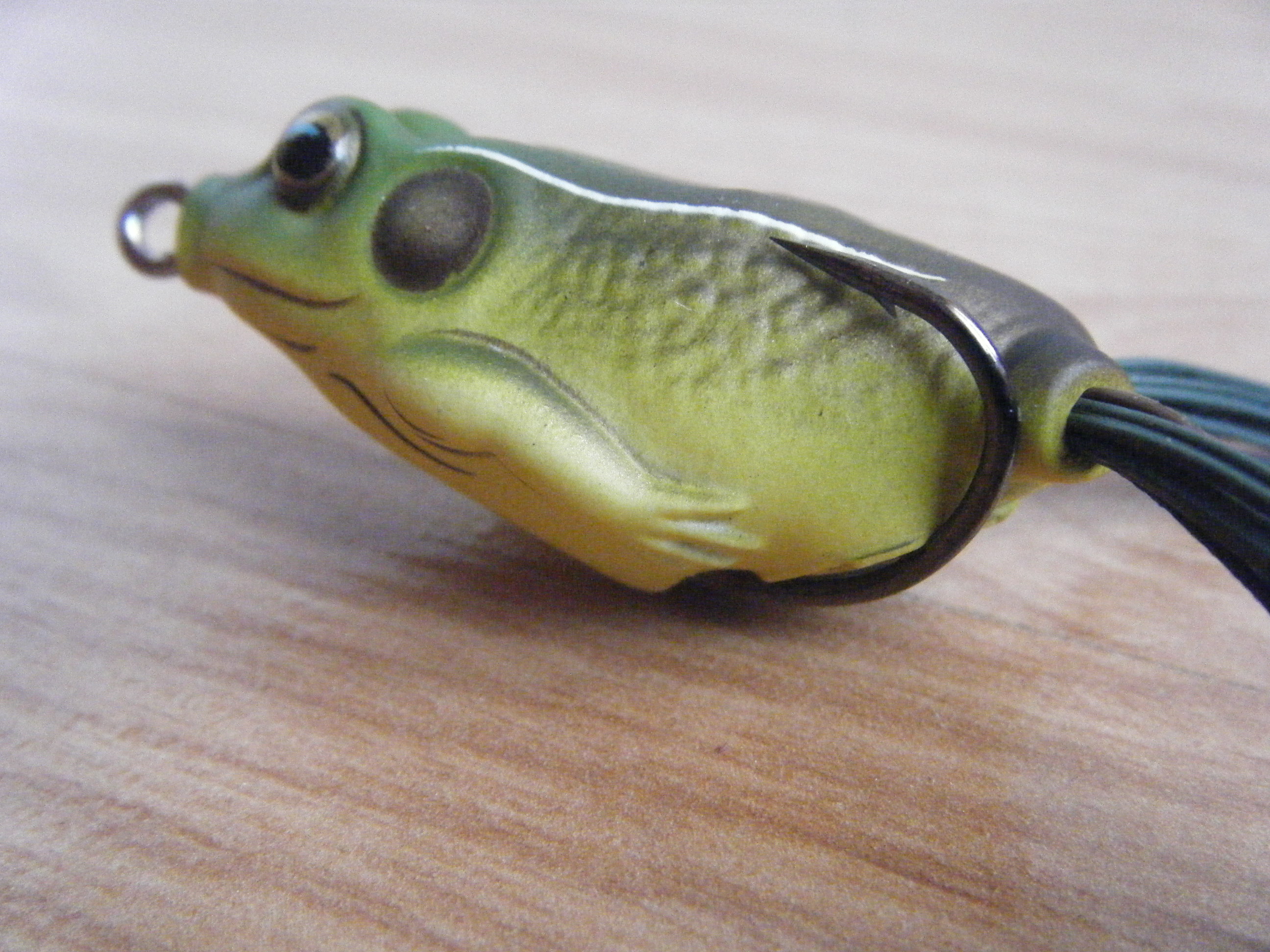 Todos este conjunto esta montado sobre un doble anzuelo de gran calidad y resistencia, que será de grosor acorde al tamaño elegido de rana. En este caso hemos optado por el tamaño “mini” de esta rana, y tiene unos anzuelos muy delgados que facilitan la clavada, su anilla frontal es un poco demasiado grande, aunque su acción giratoria facilita su natación errática entre la vegetación.