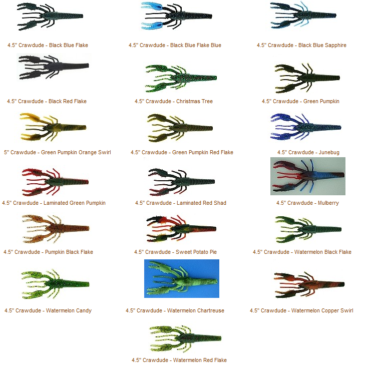 Wave worm hace muchos años introdujo una imitación a cangrejo de 4’5“ que tuvo una buena aceptación, este cangrejo se denomina “Tiki-Crawdude” y puede encontrarse en paquetes de 7 unidades por un precio aproximado de 7€.