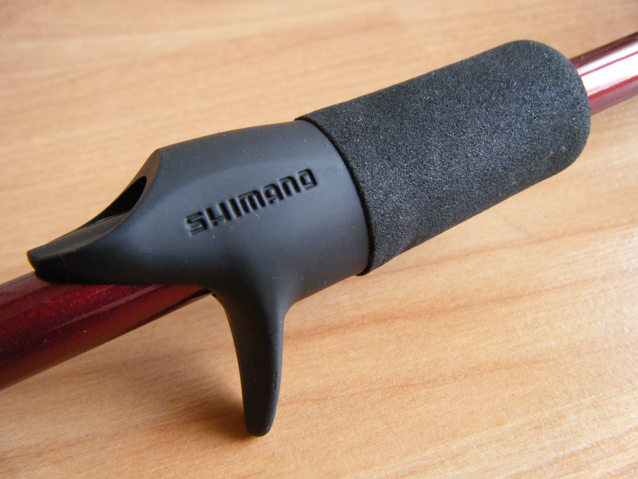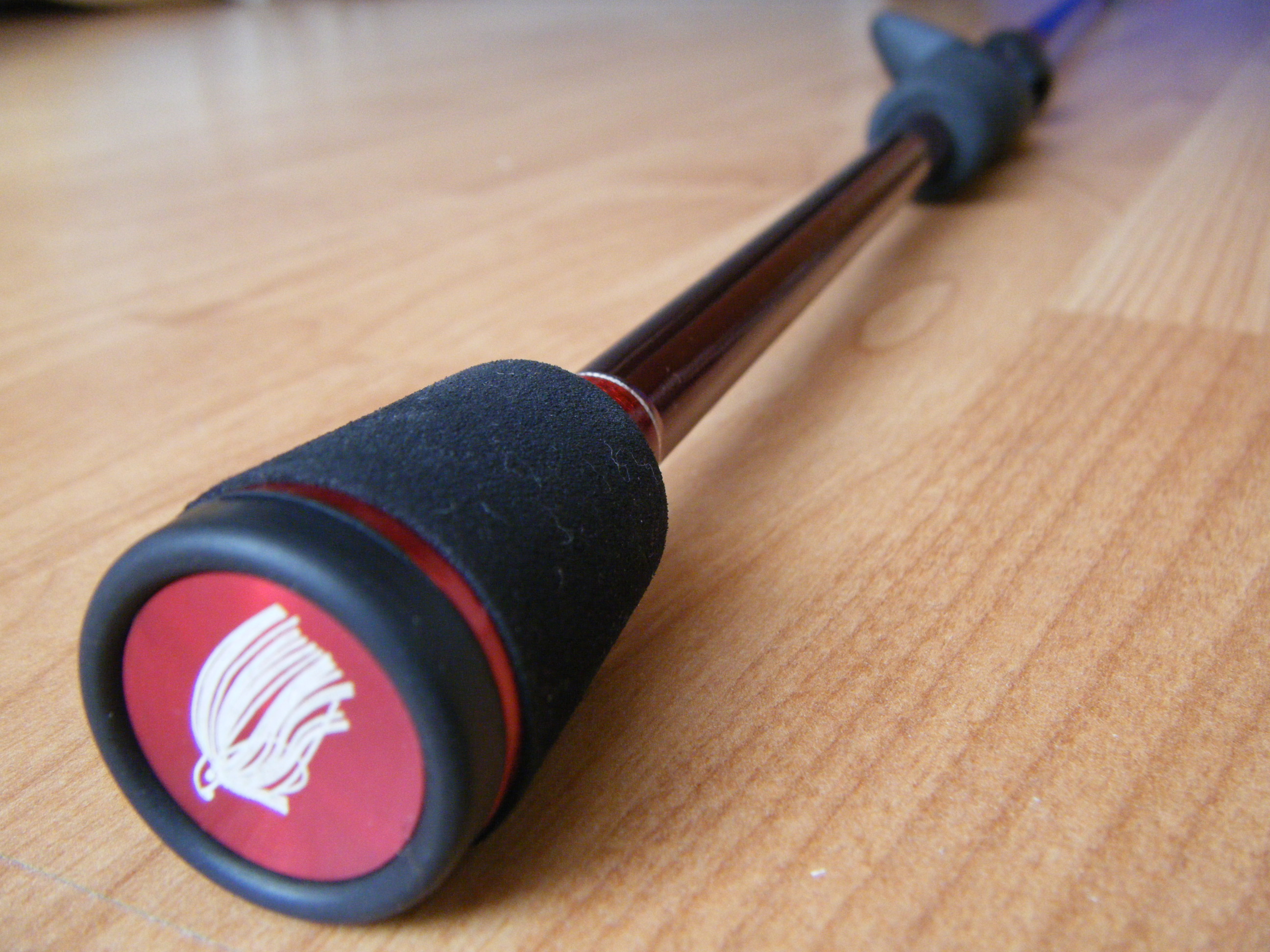Después de un largo trozo de blank expuesto con una terminación en granate, encontramos la parte final de la empuñadura, diseñada con una forma de campana poco progresiva y corta fabricada en eva, donde se a incorporado un anillo en aluminio del mismo color del blank así como una plaquita con un dibujo del uso especificado de la caña.