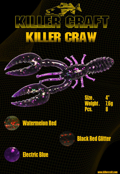 Killer Craft introdujo en el mercado un cangrejo realmente efectivo que recibe el nombre de “Killer Craw”. Este cangrejo esta disponible por un precio aproximado de 5.50€ en el siguiente tamaño y colores: