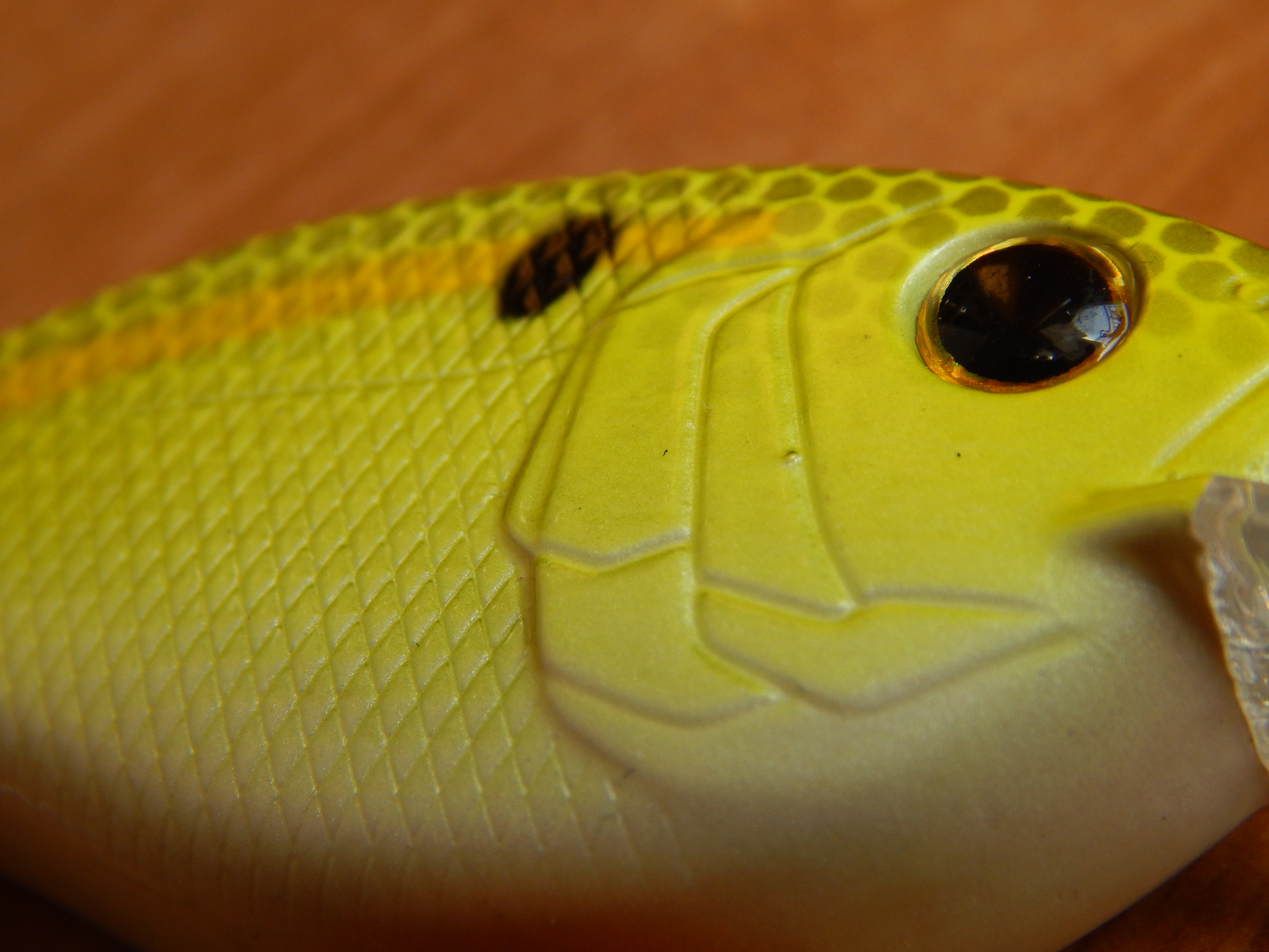 La pintura que se utiliza es resistente y combina diferentes colores con una buena terminación, ofreciendo en su parte superior un acabado en formas de escama. Para ayudar a dar ese toque de naturalidad a la apariencia del señuelo, se le ha realizado un rayado lateral simulando las escamas así como unas grandes agallas.