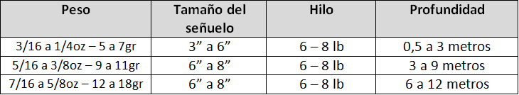 - En forma de lágrima, un diseño menos utilizado que los anteriores, pero de gran utilizad en zonas con vegetación blanda. Permiten una caída vertical, logrando pescar así en los claros de la vegetación al no desviarse al profundizar.