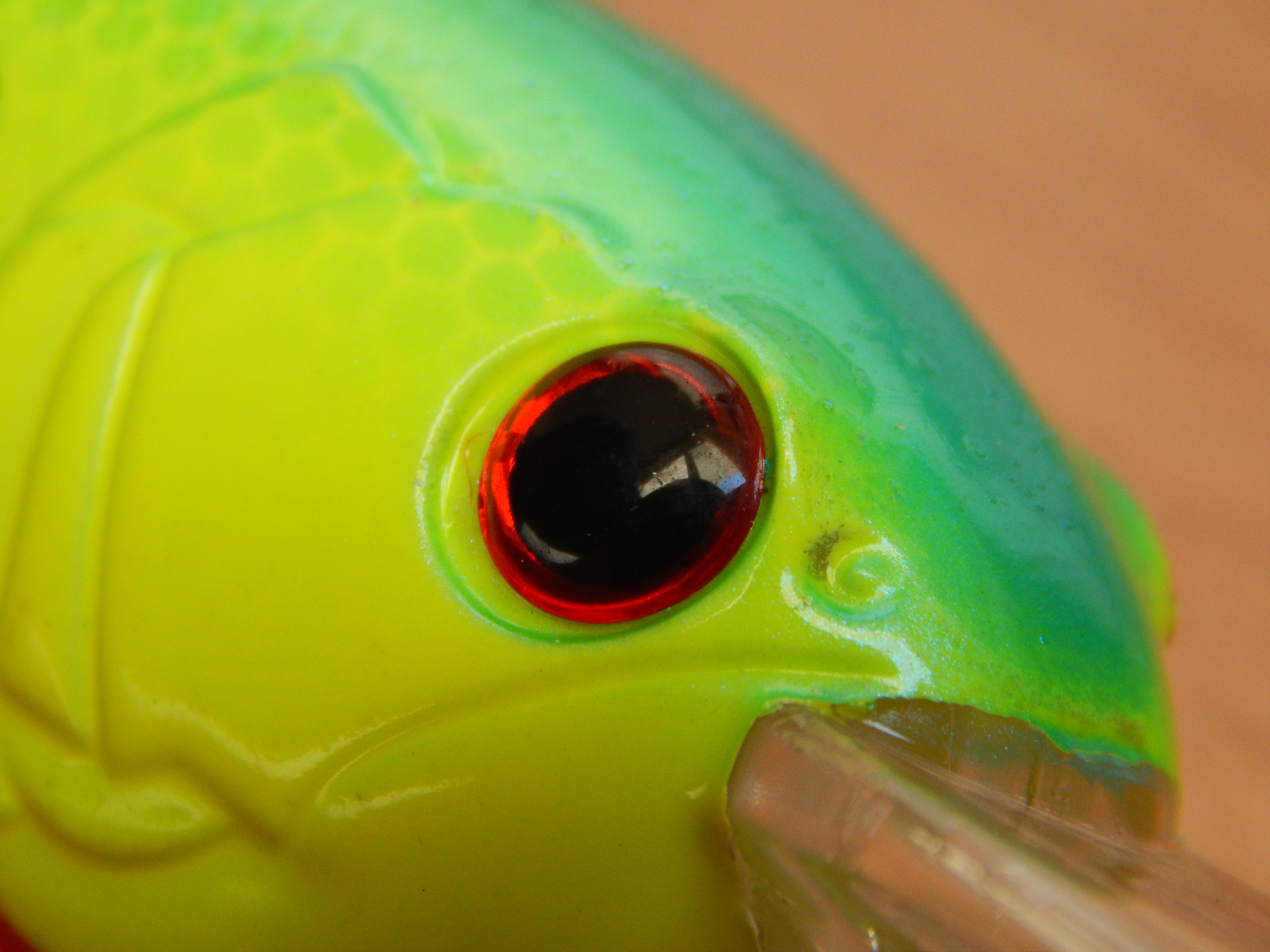 A simple vista destacan dos grandes ojos en 3D para elevar la naturalidad del mismo así como un rayado lateral y unas grandes agallas sobredimensionadas.