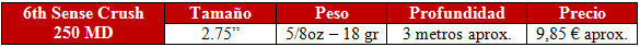 6th Sense fabrica el “Crush 250MD”. Este crankbait conserva una construcción similar a su hermano mayor 300DD pero con varias modificaciones que afectan a su acción dentro del agua.