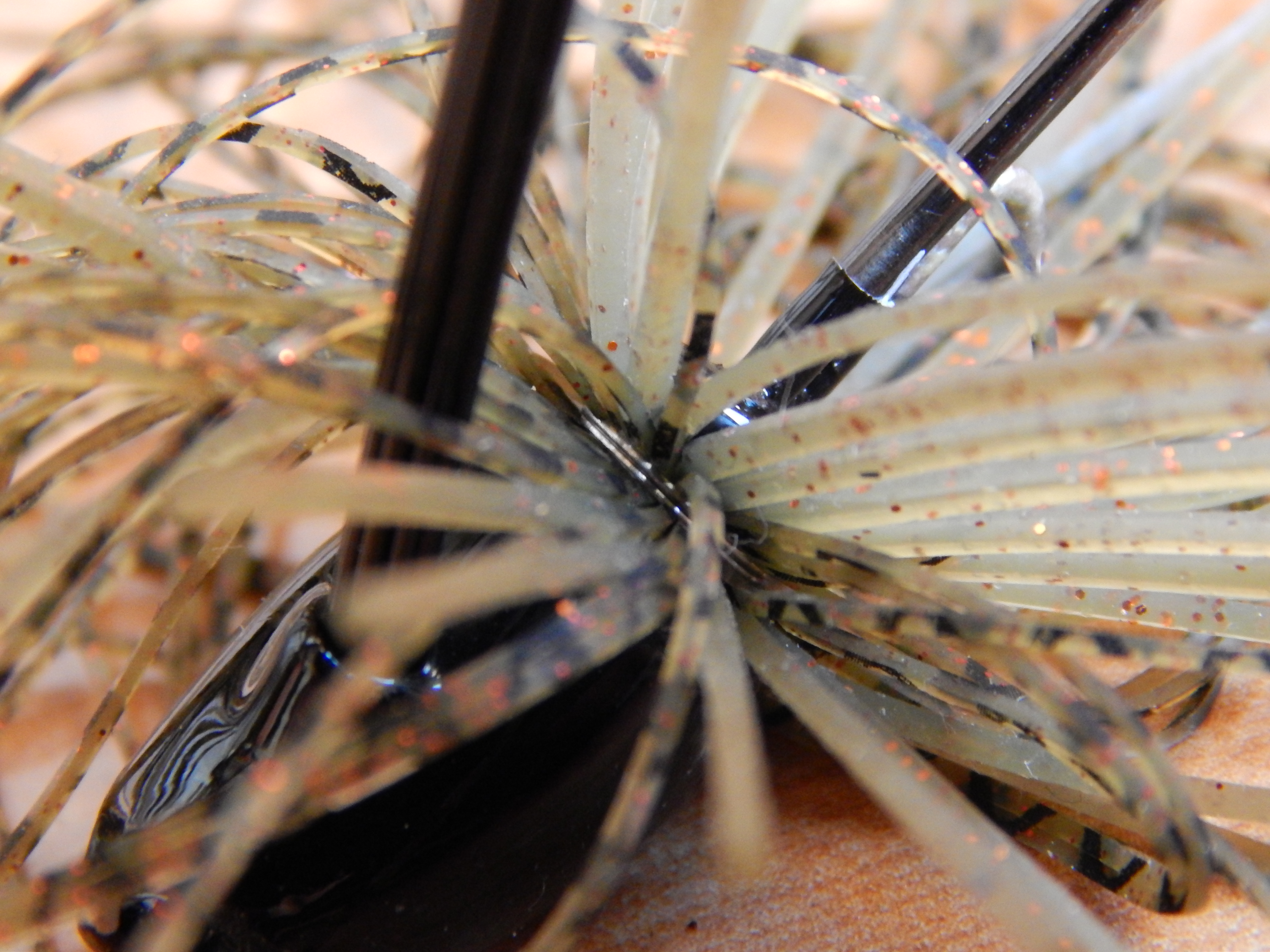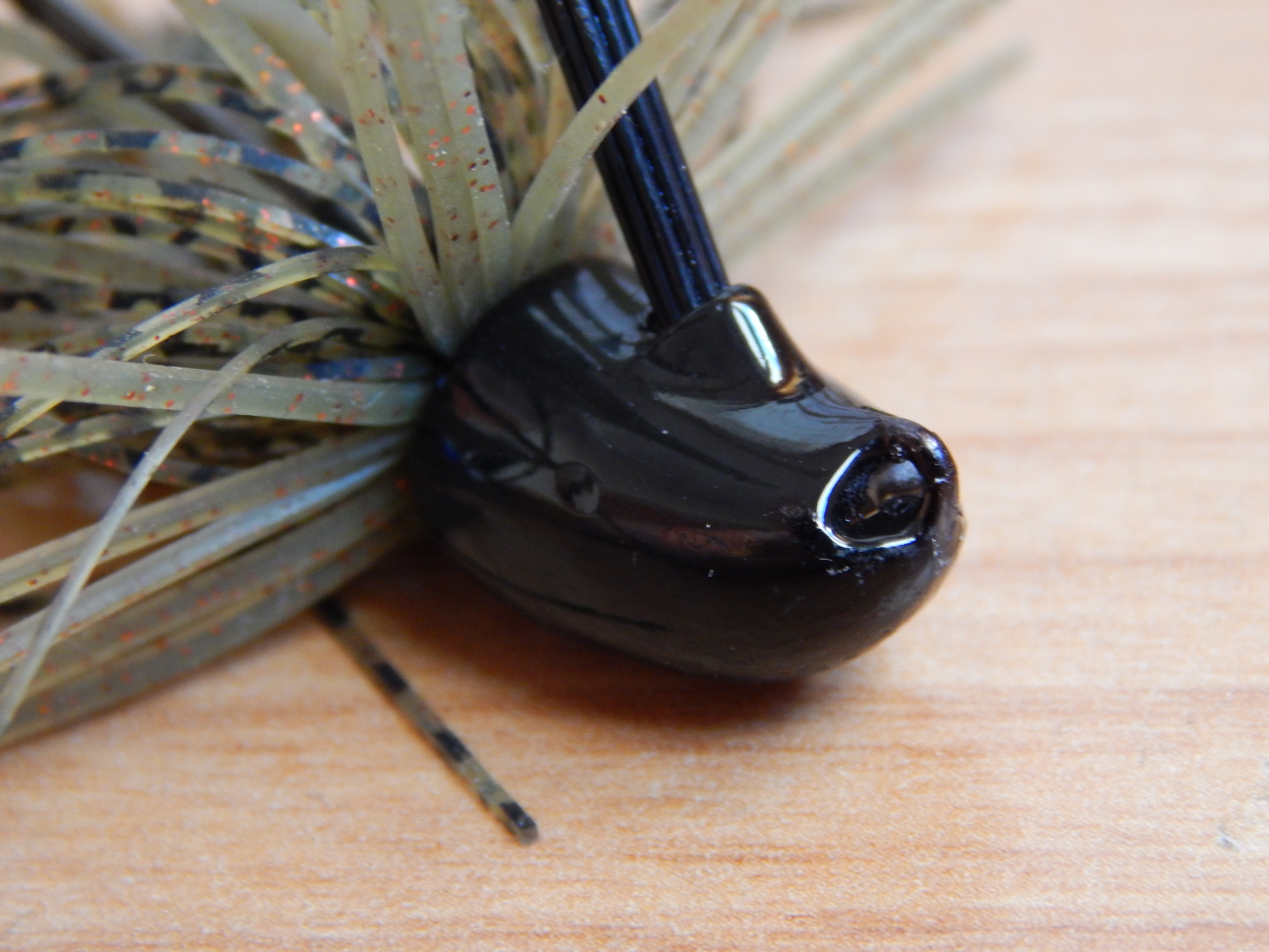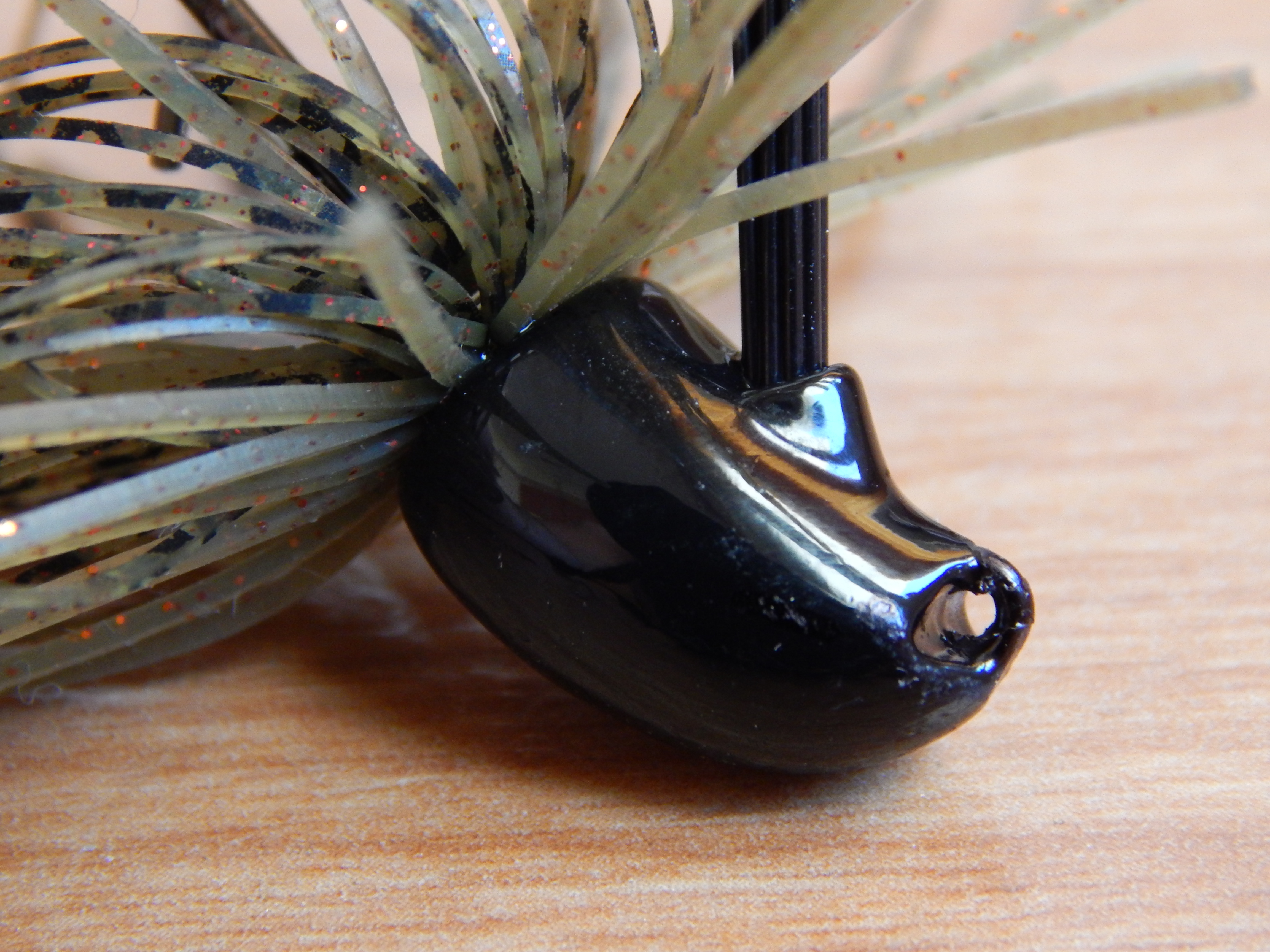 La cabeza está realizada de forma redondeada y puntiaguda para favorecer y agilizar la pesca en coberturas, facilitando la penetración y disminuyendo la fricción. La capa de pintura en color negro que se le aplica destaca por ser bastante resistente. El ojo del anzuelo se encuentra “escondido” para ofrecer un diseño compacto.