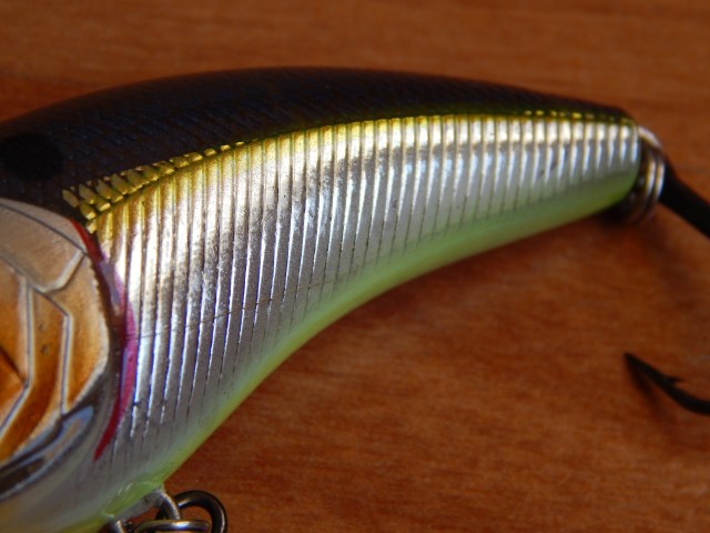 La pintura que se utiliza es resistente y combina diferentes colores con una buena terminación, ofreciendo en su parte superior un acabado en formas de escama. Para ayudar a dar ese toque de naturalidad a la apariencia del señuelo, se le ha realizado un rayado lateral simulando las escamas.